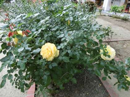 写真は中庭の黄色いバラと、中之島バラ園の見事な花です。