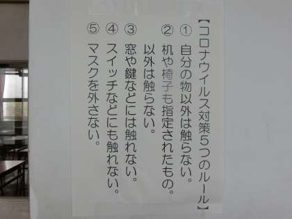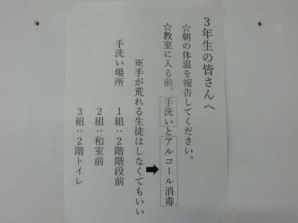 校内では、正門で検温の確認、教室に入る前に、手洗いやアルコール消毒。