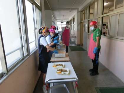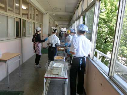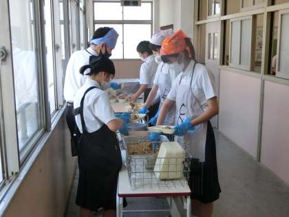 当番生徒は、三角巾にエプロンをつけ、おかずを配膳して行きます。