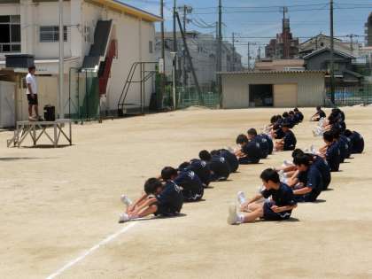 男子体育では、生徒間の距離をとりながら、補強運動を行っています。