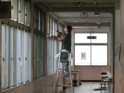 今日も、管理作業員さんが、廊下の窓の目隠し作業を行ってくれています。
