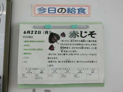 今日のメニューは、豚肉と野菜の炒め物、わかめとジャガイモの味噌汁、キャベツの赤シソ和え、焼きのりです。