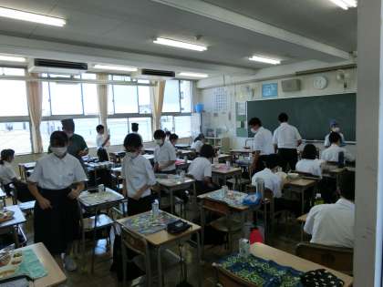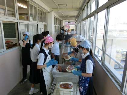 係生徒と先生方が、三角巾・エプロン・手袋姿で、手際よく準備してくれています。