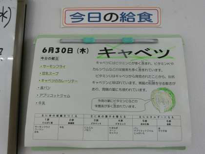 6月最後のメニューは、サーモンフライ、ベーコンと野菜の豆乳スープ、キャベツのカレーソテーです。