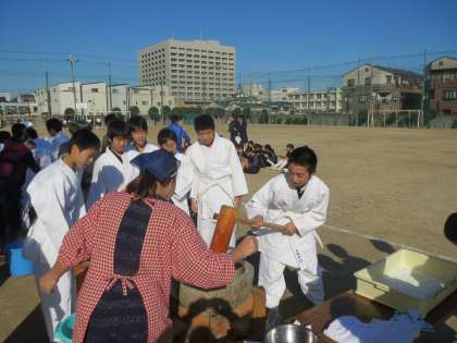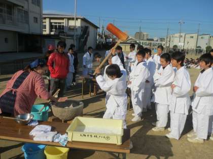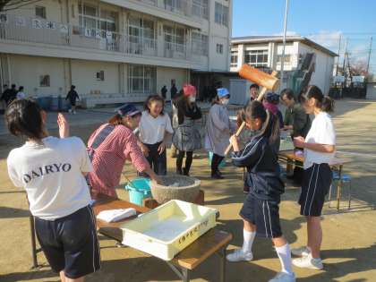 大領中学校の伝統行事である大領祭が12月5日(金曜日)に開催されました。PTA保護者の皆様は前日より準備をしていただきました。当日はやや寒かったですが、好天に恵まれ、生徒の皆さんは、体育の授業時間の柔道着のままで餅つきをしてくれました。女子の生徒も男子に負けじと力強く餅つきをしてくれました。地域から応援に来ていただきました皆様、PTA保護者の皆様、寒い中大領祭開催にご尽力いただきありがとうございました。また多くの来賓の皆様もお出でいただきました。無事に開催できましたことをうれしく思います。生徒の皆さんは、美味しいお餅と豚汁で身体とともに保護者や地域の皆様のご厚意に心も温めてくれたと思います。ありがとうございました。心よりお礼申し上げます。