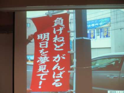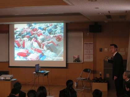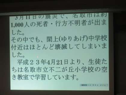 今回の講演では東日本大震災で大きな被害を受けた宮城県名取市の閖上(ゆりあげ)小中学校の被害の様子についても詳しくお話しいただきました。