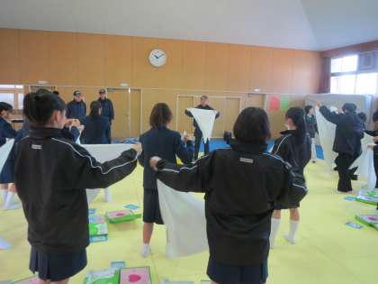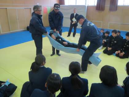 格技室では、住吉消防署の皆さんのご指導により応急救護訓練を実施しました。三角巾の使用方法や応急担架の使い方など丁寧にご指導いただきました。ありがとうございました。本日一日の防災についての講演や防災訓練で子どもたちの防災についての意識は大幅に向上したと思います。今後も、防災についての技術や技能の向上とともに、救命・救急活動に取り組もうとする意識の向上を図る取り組みを住吉区役所や住吉消防署また地域の町会の皆様の協力を得て進めてまいります。よろしくお願いいたします。