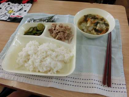 豚肉のごまだれ焼きときゅうりのおかか和えをご飯にのせて、海苔をまぶしていただきました。