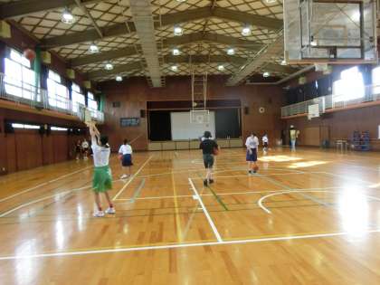 今朝は、女子バスケットボール部が練習しています。 目標を持って、シュート力を磨いてください。