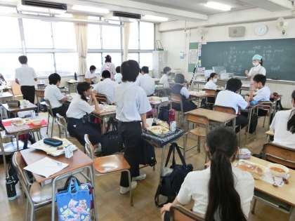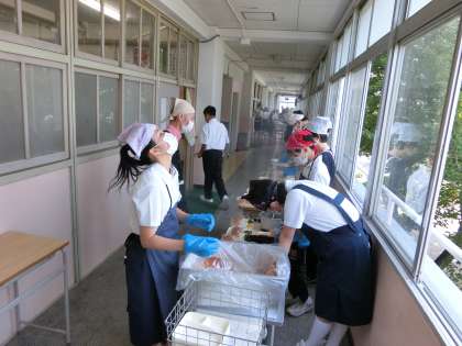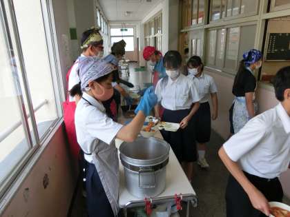 野菜たっぷりのケチャップ煮の香りが、廊下教室に漂います。