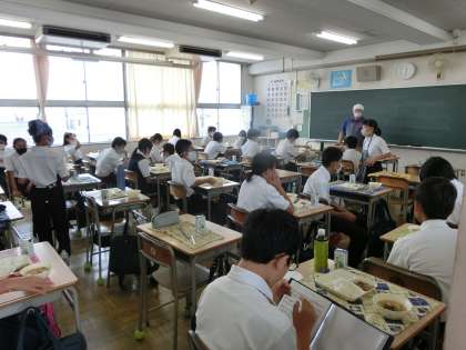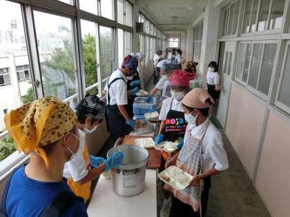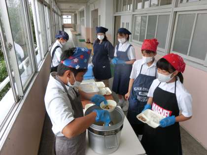 終業式、学年集会・学級活動後、給食の準備に入りました。