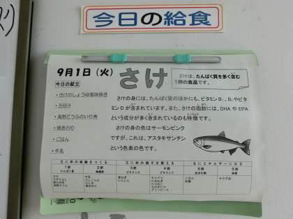 今日のメニューは、「鮭の醤油風味焼き」「五目汁」「高野豆腐の炒り煮」です。