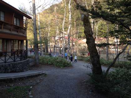 穂高連峰をバックに記念写真を撮りながら散策しました。その後、宿舎に入館しました。