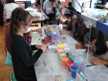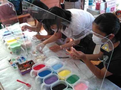 色々な砂、貝殻、小さな動物や魚をあしらって作成して行きます。
