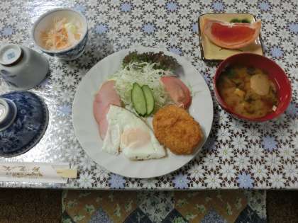 温かい味噌汁。ハムエッグにコーンコロッケ。