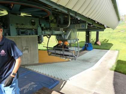 ジップライン班は、スタッフが紹介され、リフトに乗って、スキー場の頂上を目指します。