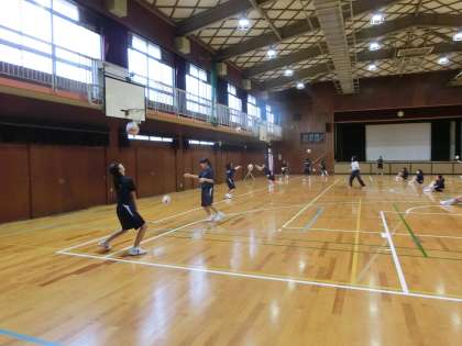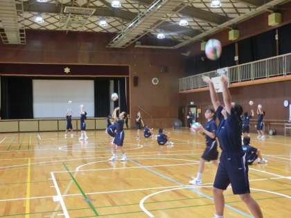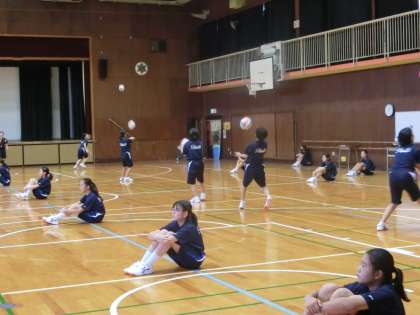 体育館で、バレーボールの授業が行われています。