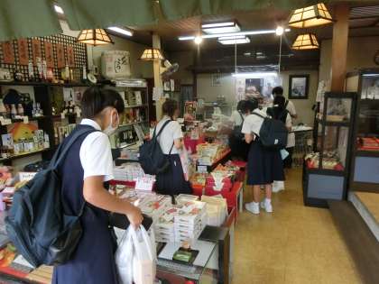 集合時間が迫り、焦りながら土産を購入しています。