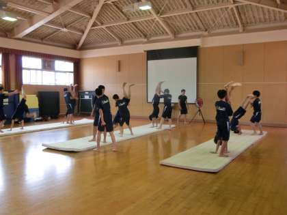 教育実習生が、マット運動の授業を行っています。