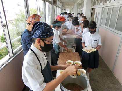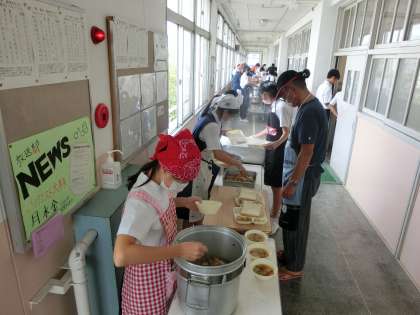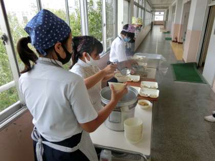 当番生徒が三角巾、エプロンをつけ、配膳を始めました。
