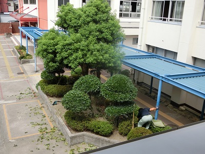 渡り廊下の木々。管理作業員さんが暑い中、剪定をしてくれています。