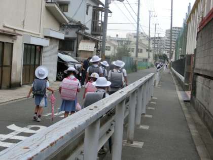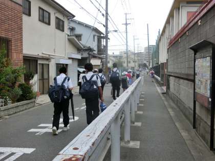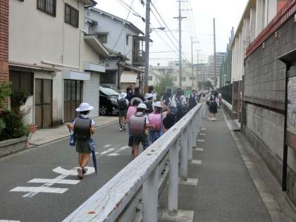 曇り空の中、児童さん、生徒たちが登校してきました。