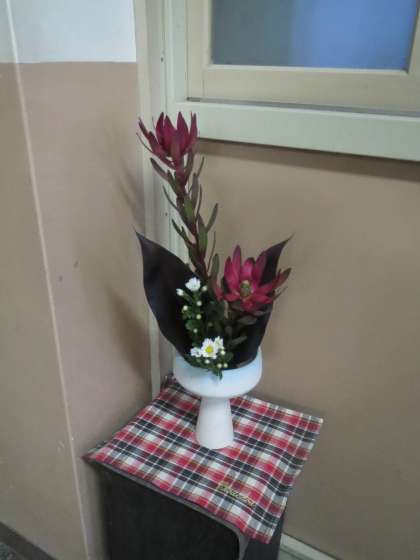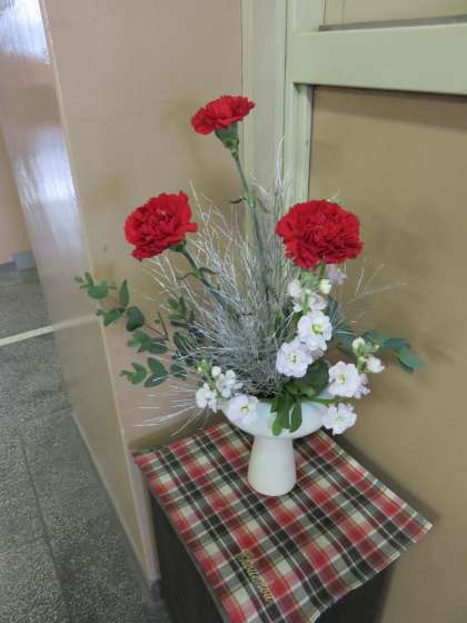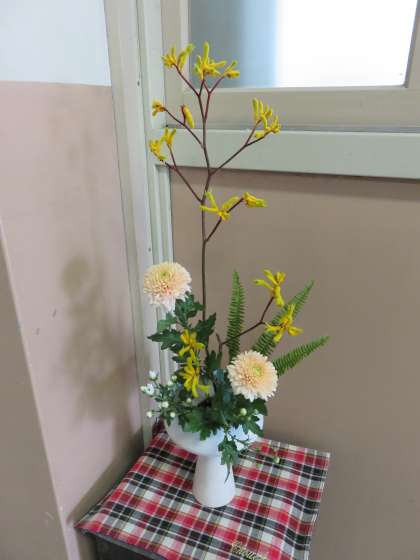 下の写真はいつも事務室前に生けていただいています生け花です。生け花の前を通る時はいつも心が和みます。ありがとうございます。