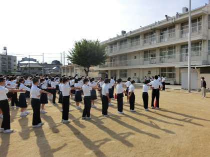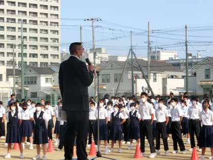 本日は、グラウンドで距離をとって全校集会を行いました。