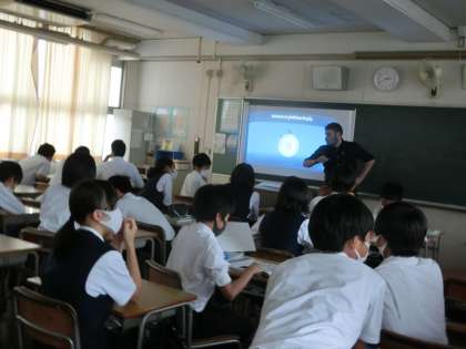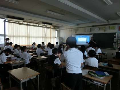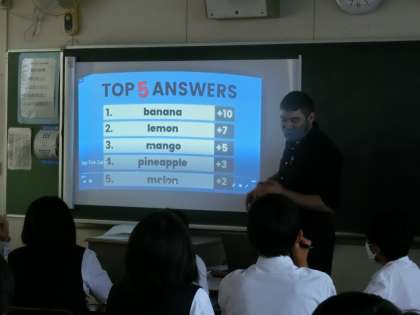 1年の授業で、ジェームズ先生がクイズ形式で質問をしています。