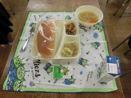 今日のメニューは「豚肉と野菜のケチャップソテー」と「野菜スープ」です。