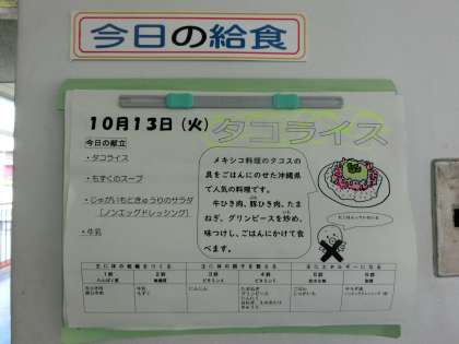 今日のメニューは、「タコライス」「もずくのスープ」「野菜サラダ」です。
