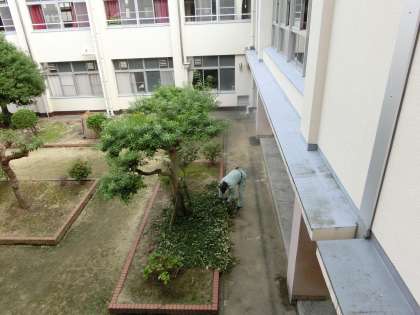 管理作業員さんが、中庭の大領桜の害虫駆除、そして樹木の剪定作業に