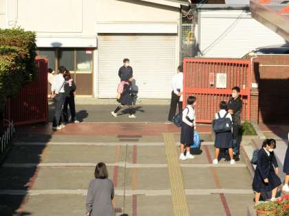 秋の日差しの中、児童さん、生徒たちが登校してきました。