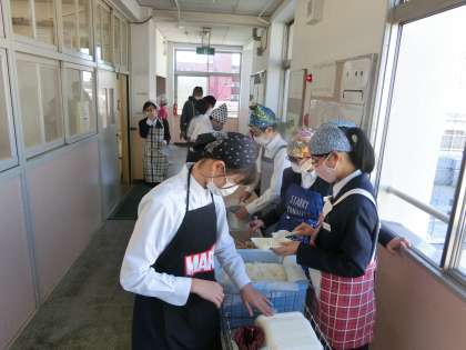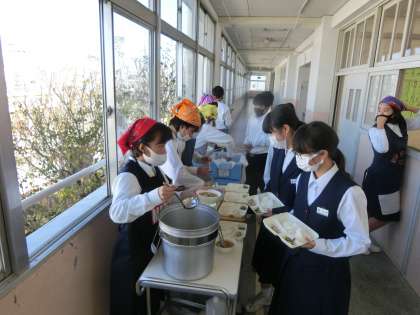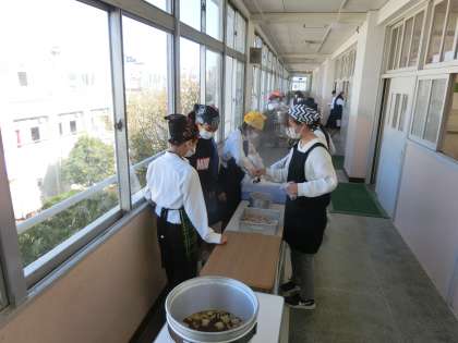 午前の授業が終了し、給食の準備に入りました。