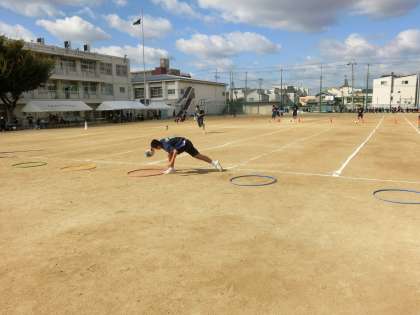 楕円形のボールは、なかなかまっすぐには転ばず、悪戦苦闘です。