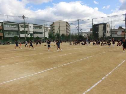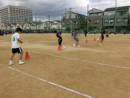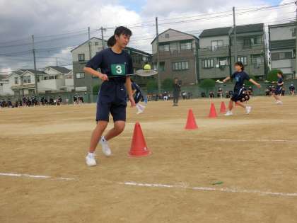 バドミントンのラケットと、テニスボールを使ったリレーです。