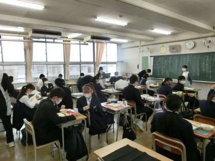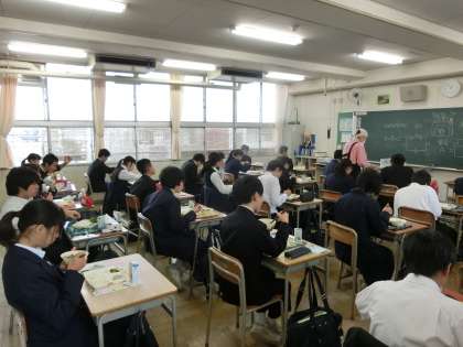 コロナ感染防止対策で、全員前を向いて、静かに食べています。