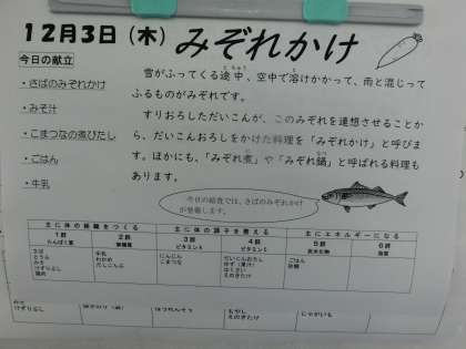 今日のメニューは、「鯖のみぞれかけ」「豆腐と野菜の味噌汁」「小松菜の煮びたし」です。