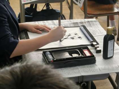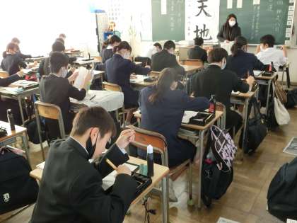 姿勢よく、各自がお手本を見て、筆を滑らせます。