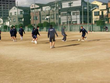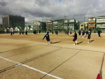 グラウンドでは、サッカーの試合を男女混合で行っています。