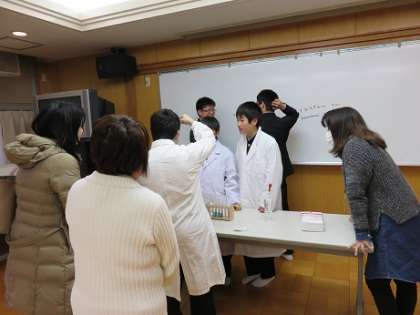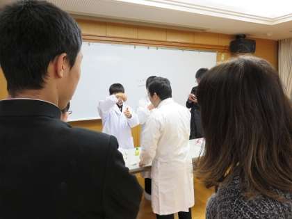 この日は、ブルーのアルカリ性溶液が、酸性物質を注入することによってピンク色に変化していく様子を生徒に実体験させていただきました。