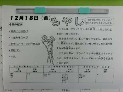 「鶏肉のから揚げ」と、「中華味噌スープ」、「もやしとコーンの甘酢和え」です。