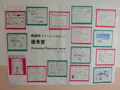 1年の英語の取り組みで、グリーティングカードが作られ、作品が展示されています。
