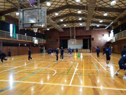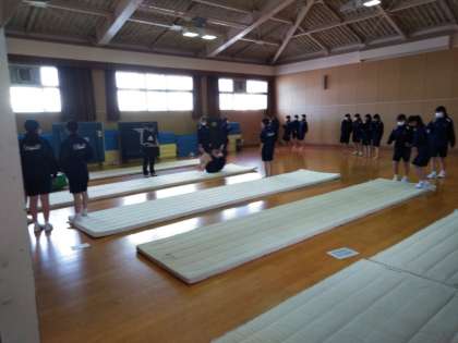 男子は体育館でバスケットボールの授業、女子は格技室でマット運動です。