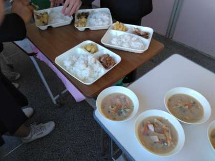 かす汁には、たっぷり野菜とうすあげ、鮭も入っています。