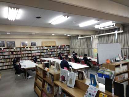 グラウンドでは体育のサッカー教室、美術室では美術のイラスト教室、図書室では国語の読書教室などが開かれています。