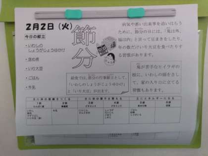 今日のメニューは、節分にちなんで「イワシ」と「福豆」です。