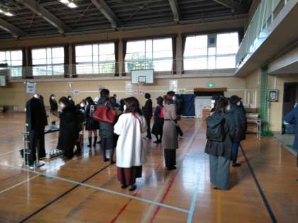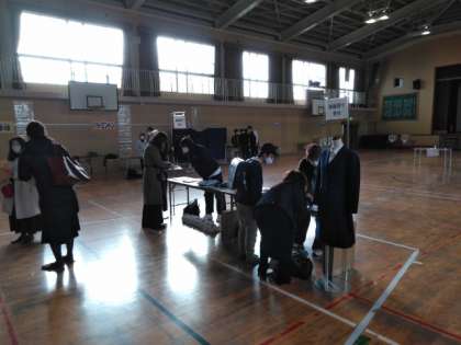 本日、大領小学校講堂において、本校新入生の制服採寸が行われています。