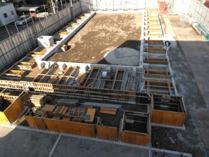 基礎の上や周囲に鉄筋が張られ、再びコンクリートパネルで囲まれました。