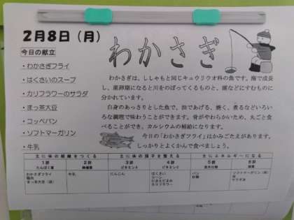 今日のメニューは、「わかさぎフライ」「白菜と鶏肉のスープ」「カリフラワーのサラダ」です。